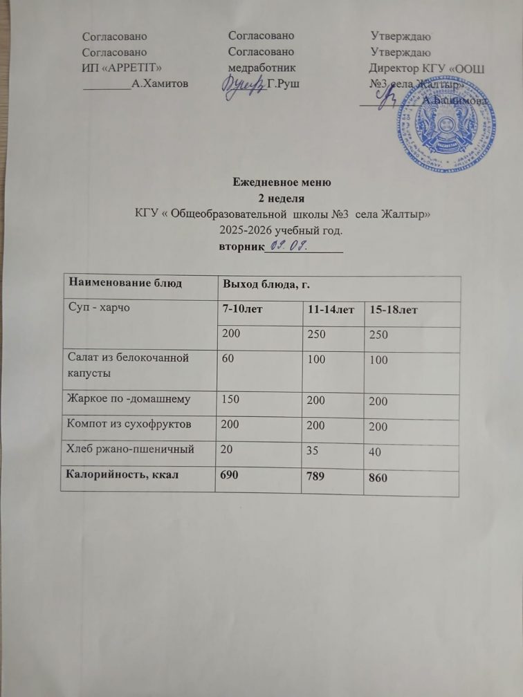 Бүгінгі "Жалтыр ауылының №3 ЖОББМ" КММ бойынша 2025 жылғы 9 қыркүйеқтегі асхананың ас мәзірі.