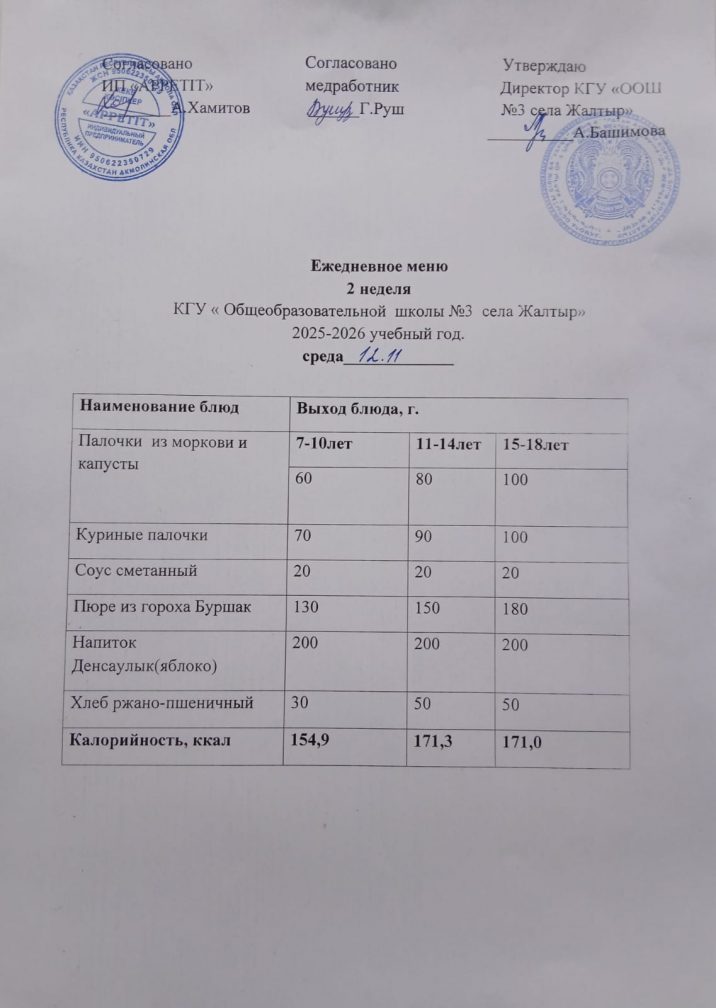 Бүгінгі "Жалтыр ауылының №3 ЖОББМ" КММ бойынша 2025 жылғы 12 қарашада асхананың ас мәзірі.