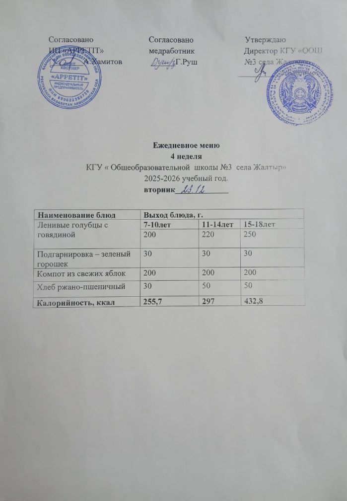 Бүгінгі "Жалтыр ауылының №3 ЖОББМ" КММ бойынша 2025 жылғы 23 желтоқсанға асхананың ас мәзірі.