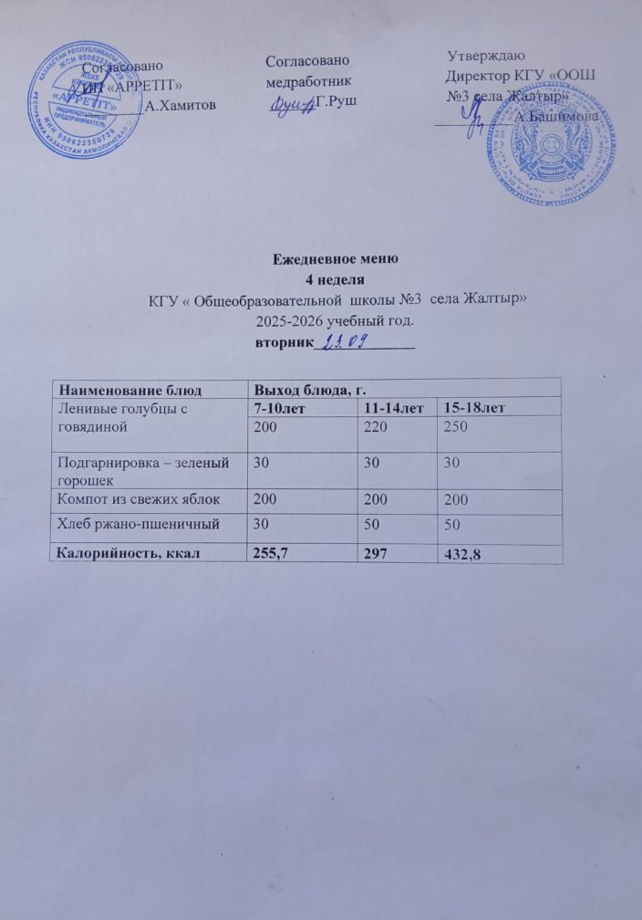 Бүгінгі "Жалтыр ауылының №3 ЖОББМ" КММ бойынша 2025 жылғы 23 қыркүйектегі асхананың ас мәзірі.