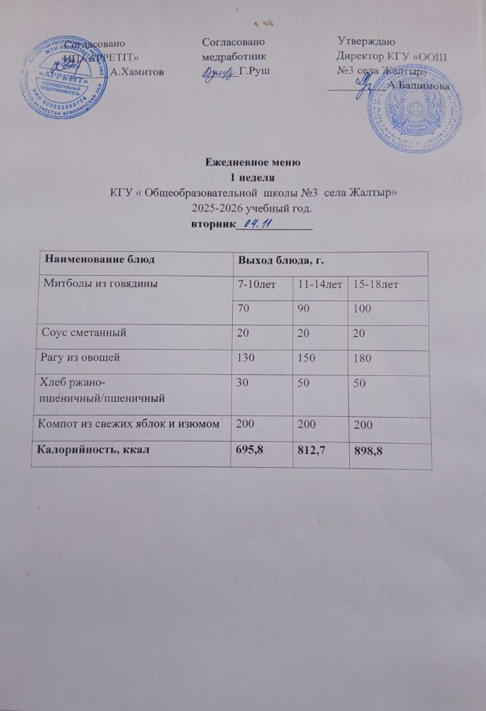 Бүгінгі "Жалтыр ауылының №3 ЖОББМ" КММ бойынша 2025 жылғы 4 қарашада асхананың ас мәзірі.