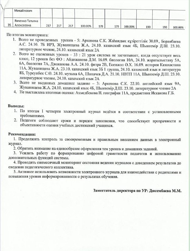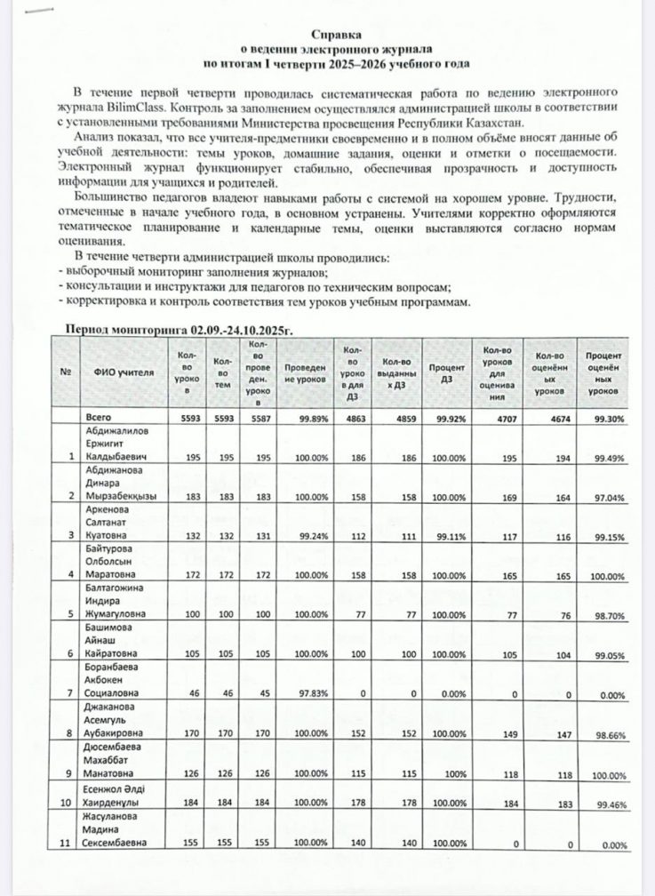 2025-2026 оқу жылының 1 тоқсанының қорытындысы бойынша электрондық журналды енгізу туралы анықтама