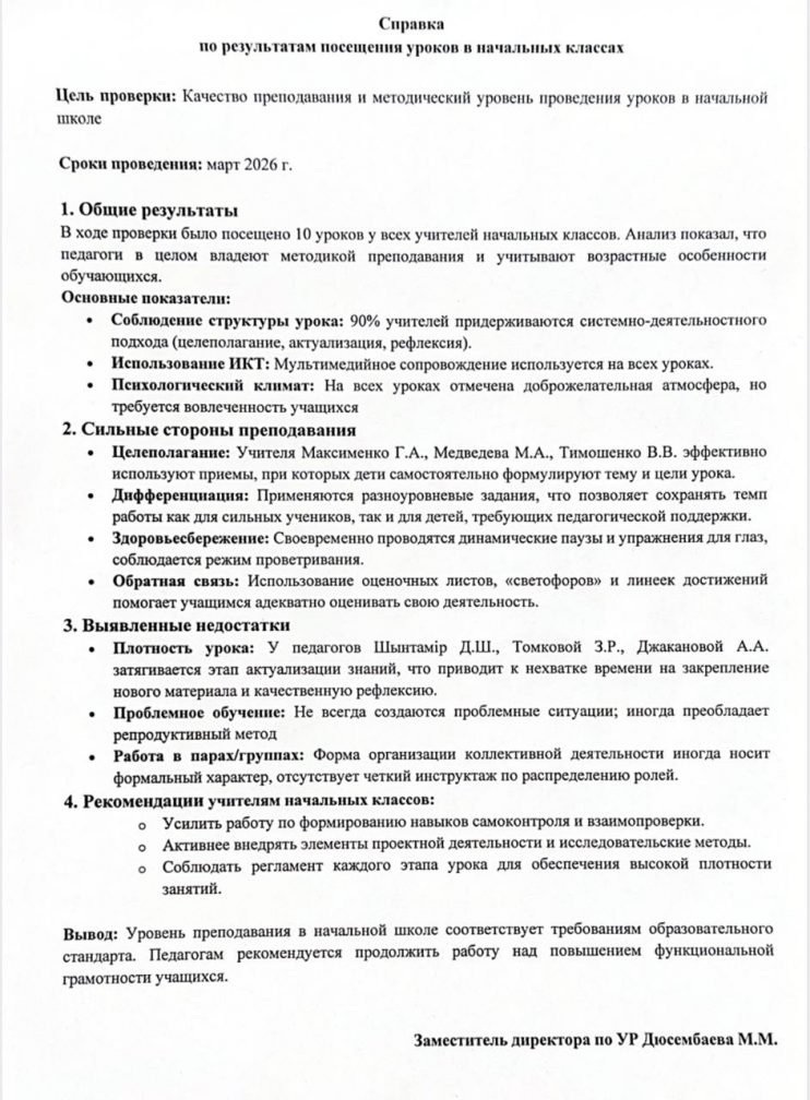 Бастауыш сыныптарда сабаққа қатысу нәтижелері бойынша анықтама