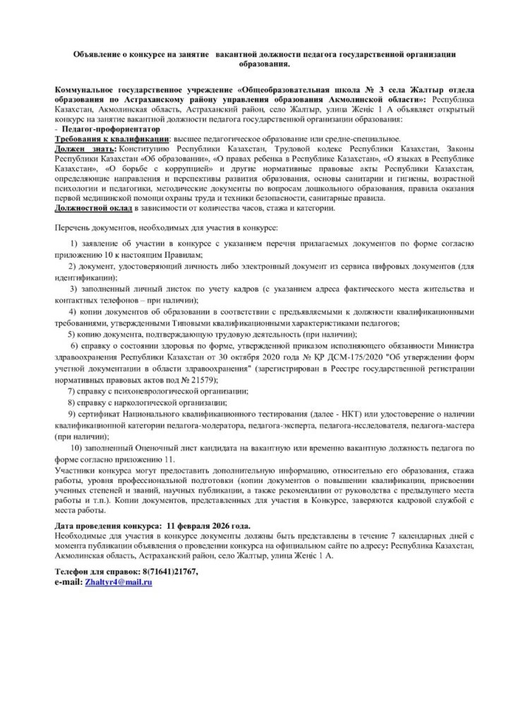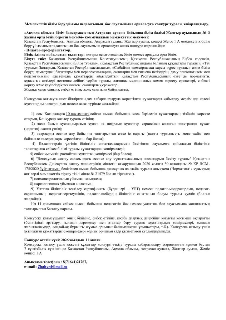 Қазақстан Республикасы, Ақмола облысы, Астрахан ауданы, Жалтыр ауылы, көшесі Жеңіс 1 A мемлекеттік білім беру ұйымының педагогының бос лауазымына орналасуға ашық конкурс жариялайды: